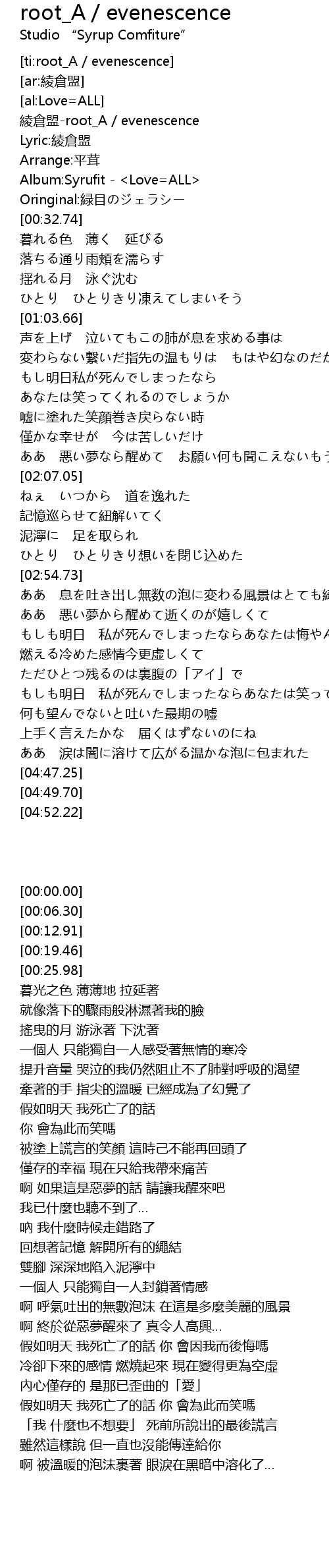 | [00:00.00] | 綾倉盟-root_A / evenescence |