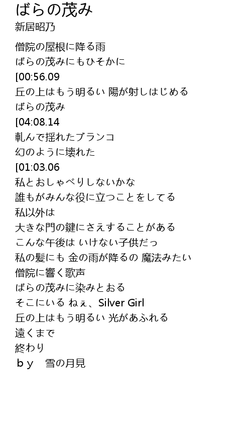 | [03:27.83][00:56.09][00:18.57] | ねぇ、Silver Girl 出ておいで |