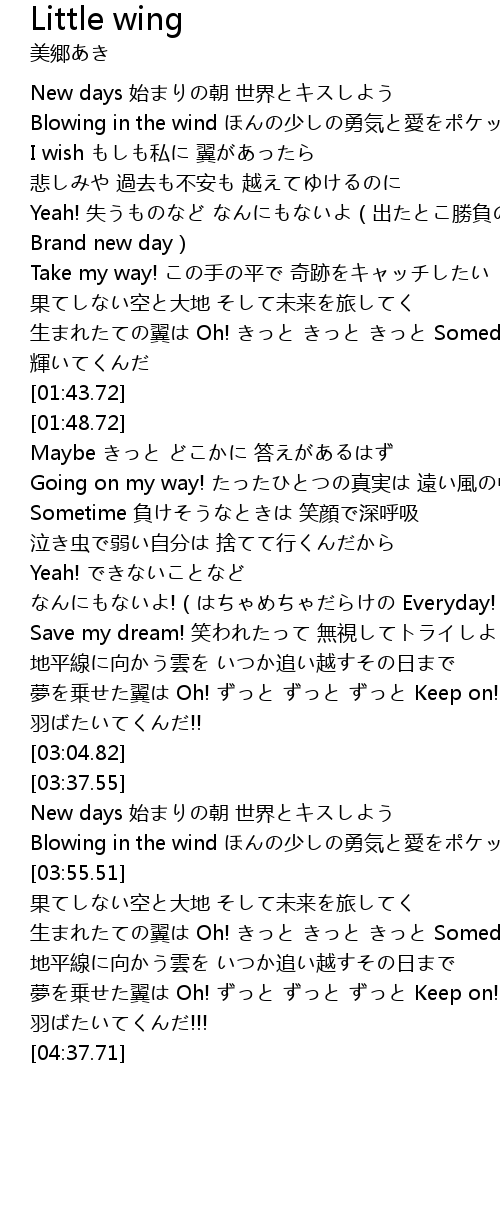 | [03:39.55] | New days 始まりの朝 世界とキスしよう |