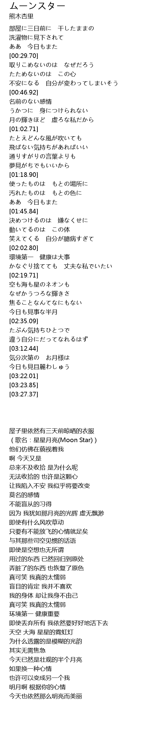 | [00:17.46] | 屋子里依然有三天前晾晒的衣服 (歌名:星星月亮(Moon Star)) |