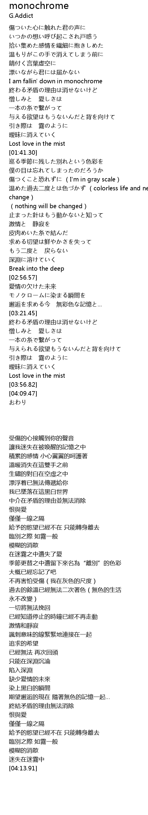 | [02:06.22] | 傷つくこと恐れずに (I'm in gray scale) |