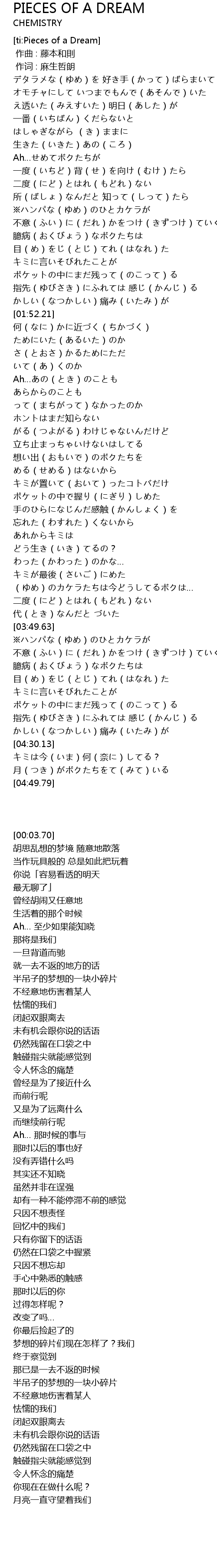 | [03:32.69] | (ゆめ)のカケラたちは今どうしてるボクは… |