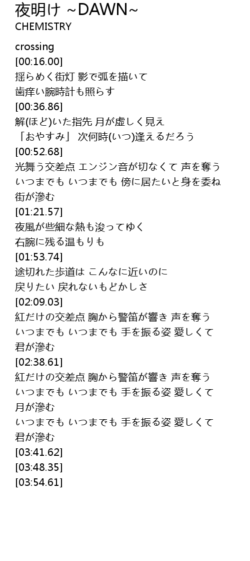 | [00:53.50] | 光舞う交差点 エンジン音が切なくて 声を奪う |
