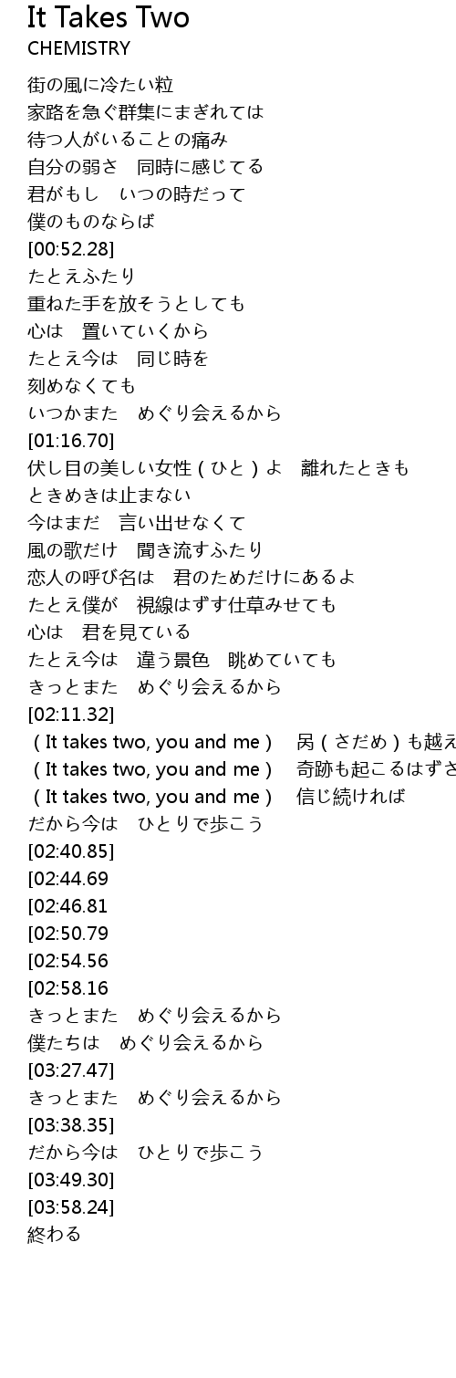 | [02:24.20] | (It takes two, you and me) 奇跡も起こるはずさ |