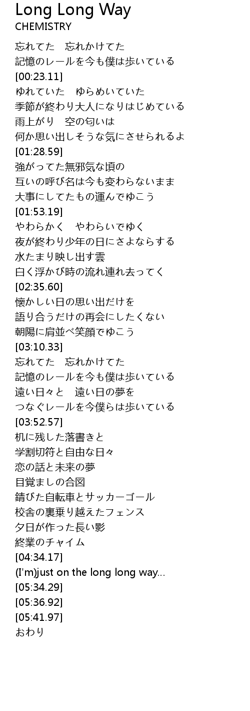 | [03:42.56] | つなぐレールを今僕らは歩いている |