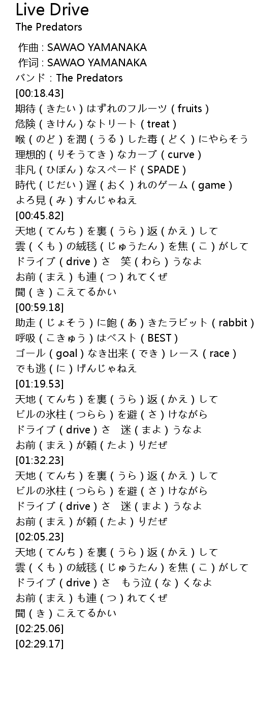 | [02:11.69] | ドライブ(drive)さ もう泣(な)くなよ |