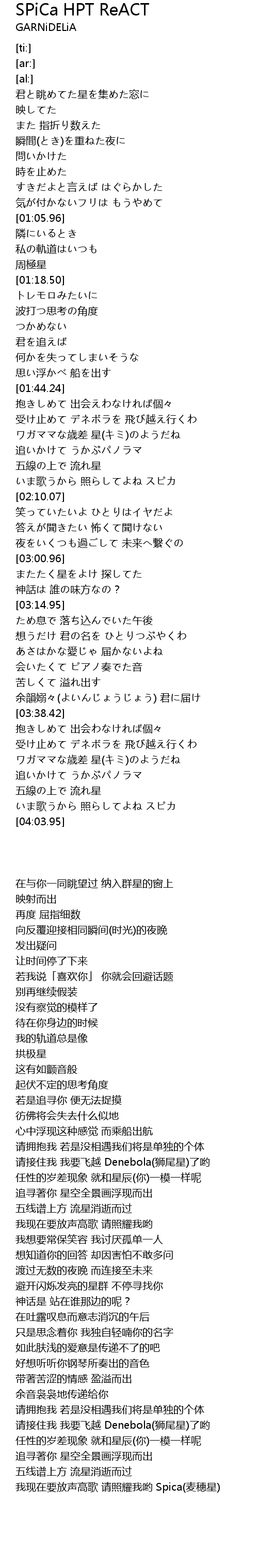 | [02:04.27] | いま歌うから 照らしてよね スピカ |
