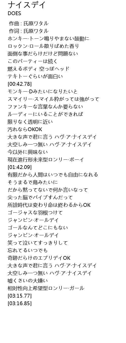 | [03:00.16] | 大空しみ一つ無い ハヴ·ア·ナイスデイ |