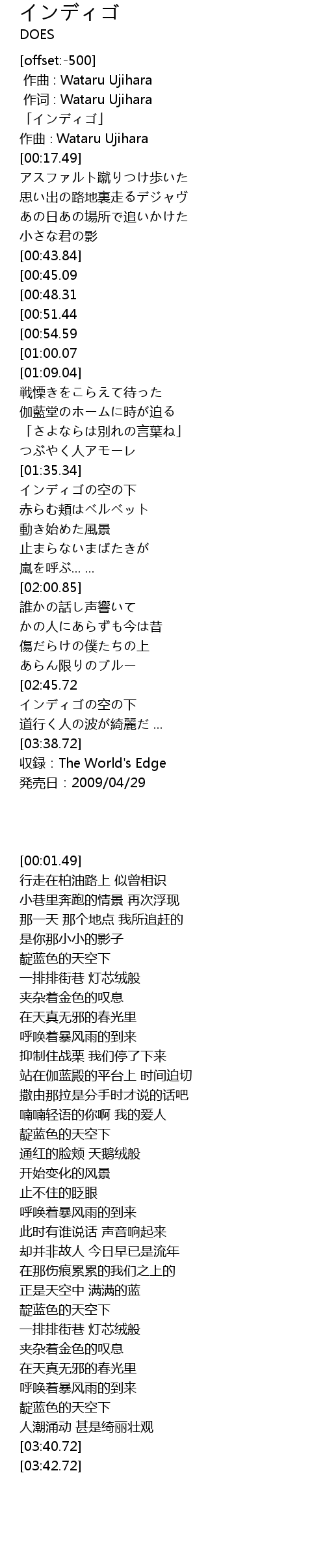 | [02:47.29][00:45.09] | インディゴの空の下 |