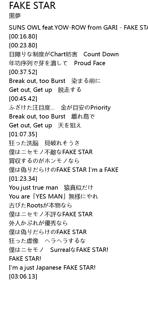 | [00:01.80] | SUNS OWL feat.YOW-ROW from GARI - FAKE STAR |