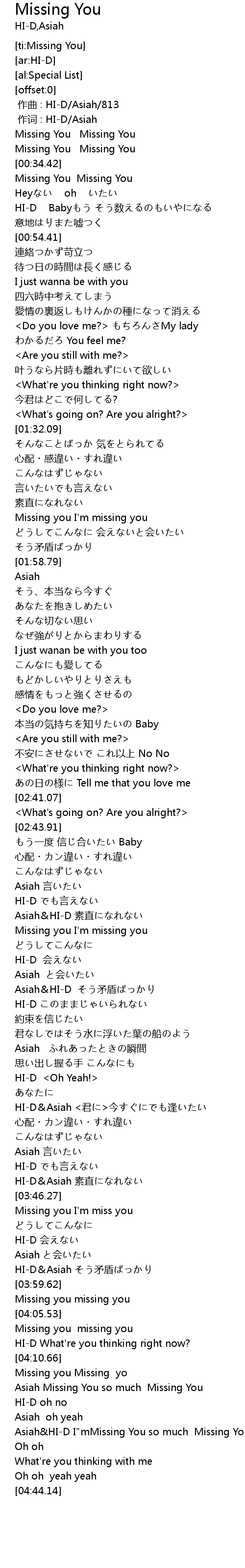| [04:27.38] | Asiah HID I" mMissing You so much Missing You |