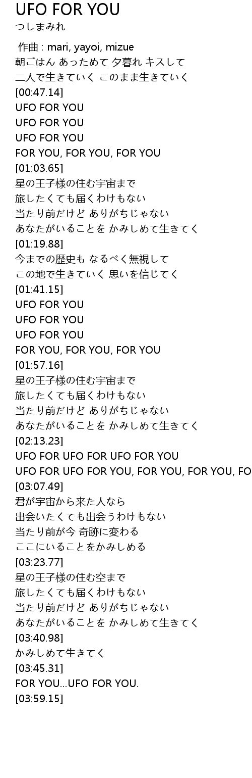 | [02:58.35] | UFO FOR UFO FOR YOU, FOR YOU, FOR YOU, FOR YOU |