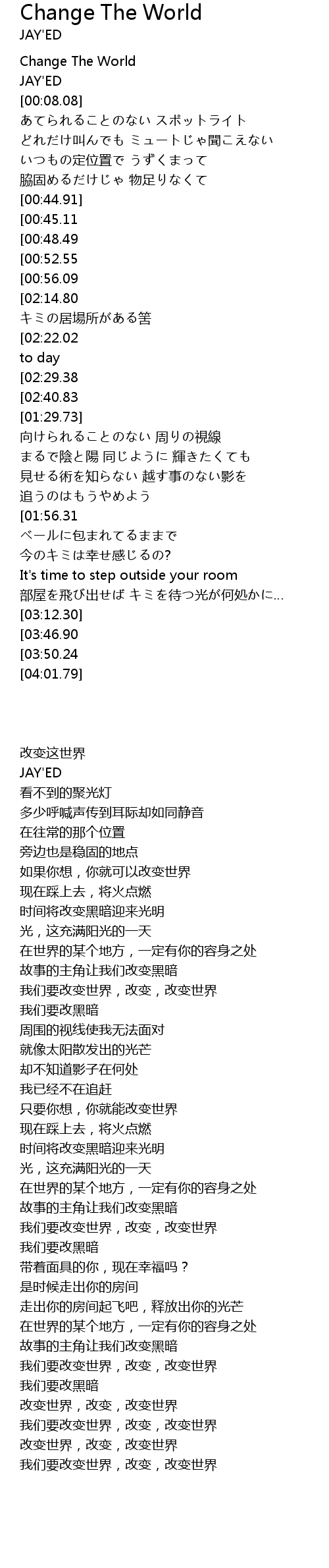| [03:57.51][03:50.24] | We gotta change the world, change, change the world |