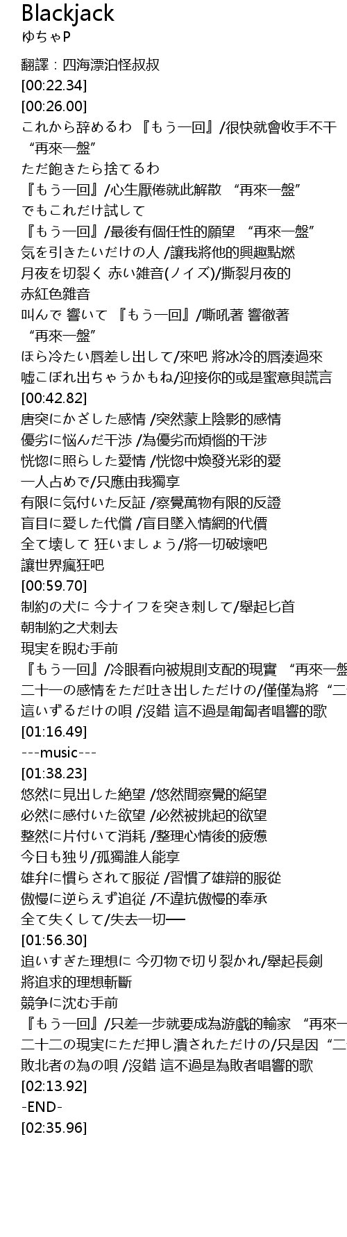 | [02:01.22] | 競争に沈む手前 『もう一回』/只差一步就要成為游戲的輸家 “再來一盤” |