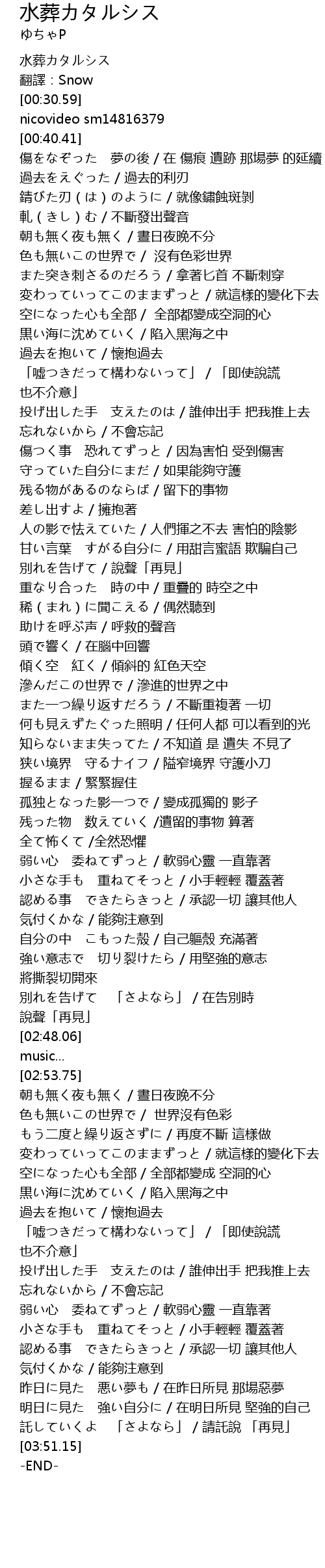 | [03:22.12] | 黒い海に沈めていく / 陷入黑海之中 |