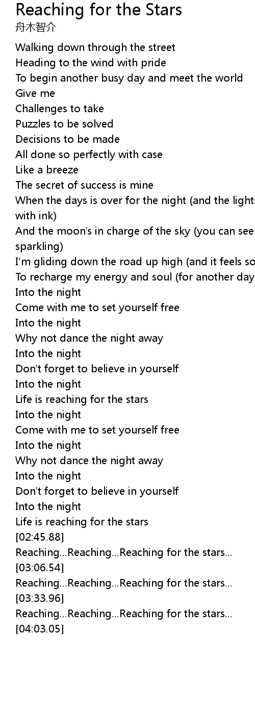 | [03:54.44] | Reaching...Reaching...Reaching for the stars... |