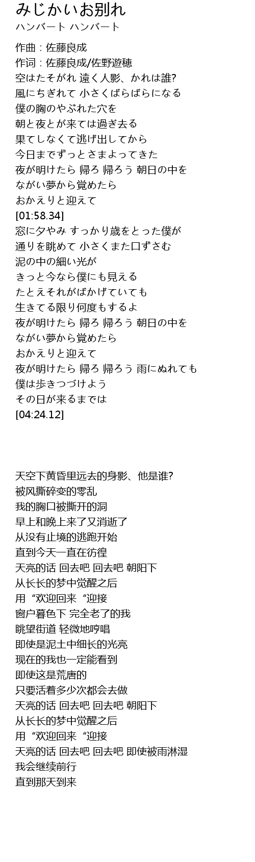 | [03:26.10] | 天亮的话 回去吧 回去吧 朝阳下 |