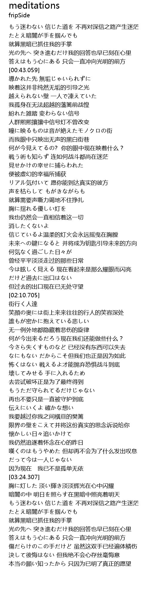 | [00:57.033] | 導かれた先 無垢じゃいられずに 映着这并非纯然无垢的引导之光 |