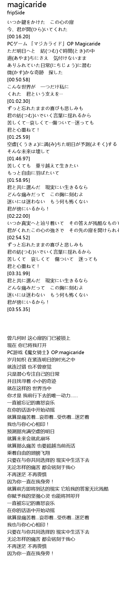 | [00:17.00] | PCゲーム 「マジカライド」OP Magicaride |