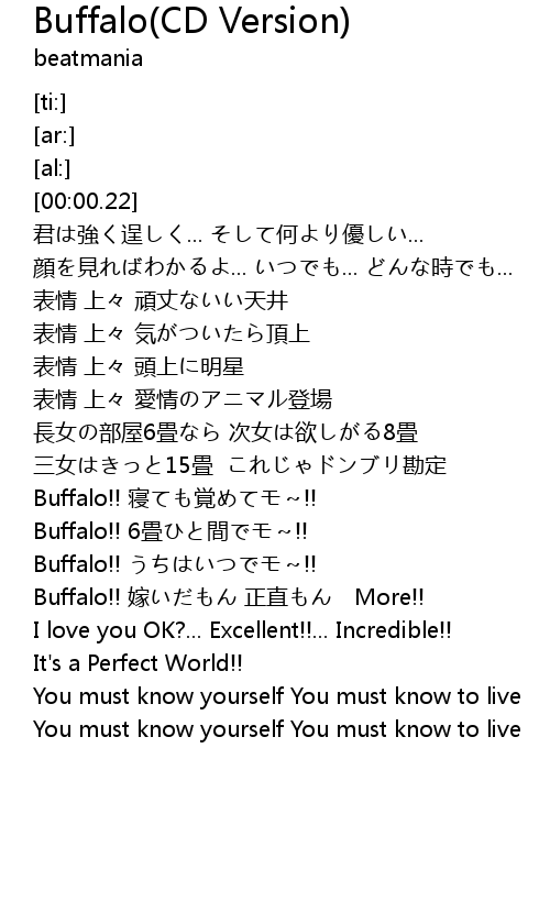 | [01:11.37] | Buffalo!! jià zhèng zhí More!! |