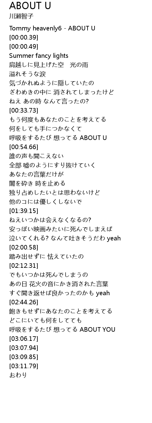 | [02:57.98] | 呼吸をするたび 想ってる ABOUT YOU |