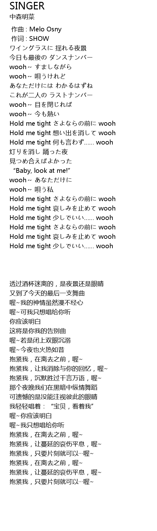 | [02:08.97] | Hold me tight 想い出を消して wooh |
