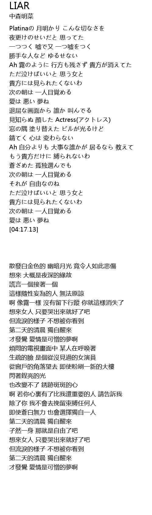 | [00:30.17] | Platinaの 月明かり こんな切なさを |