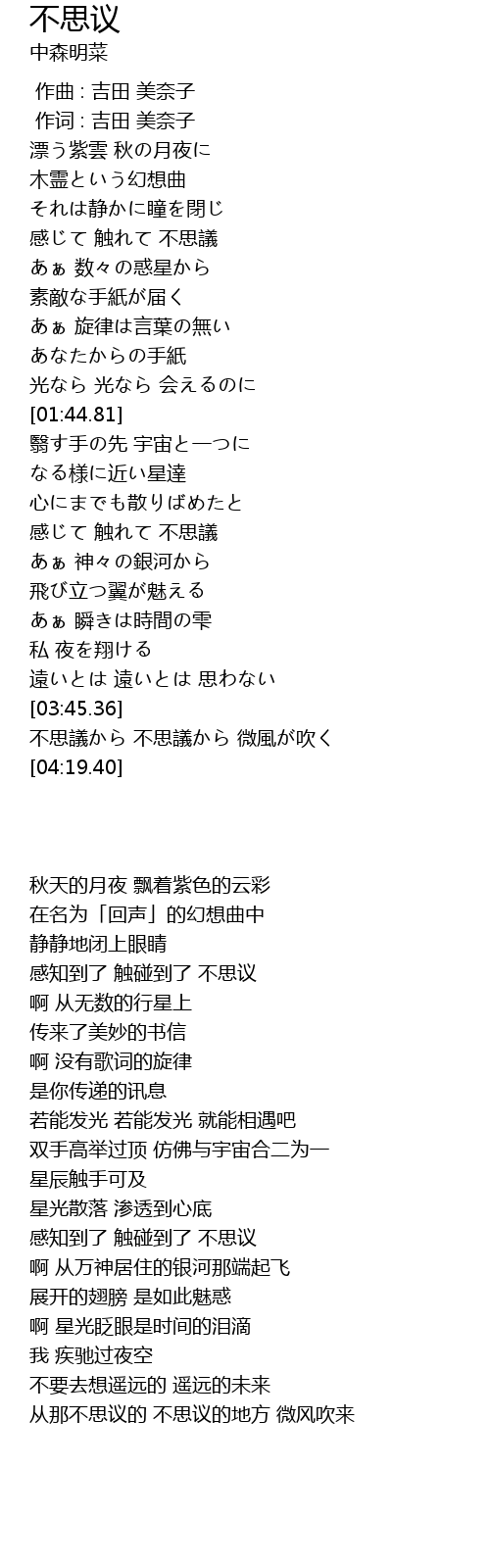 | [02:56.61] | 感じて 触れて 不思議 |