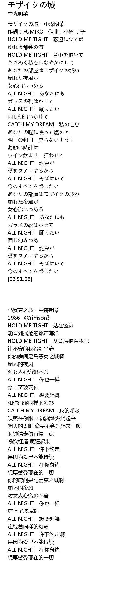 | [00:00.10] | モザイクの城 - 中森明菜 |