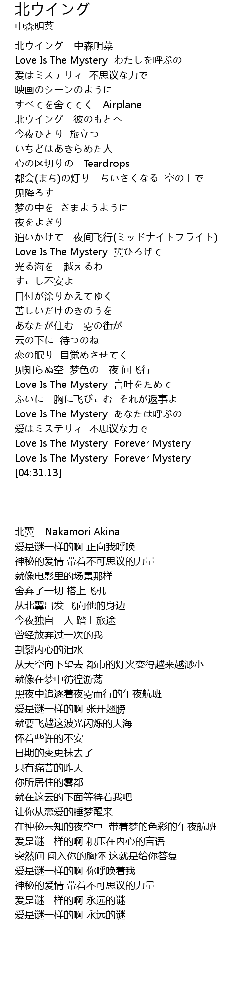 | [00:00.01] | 北翼 - Nakamori Akina |