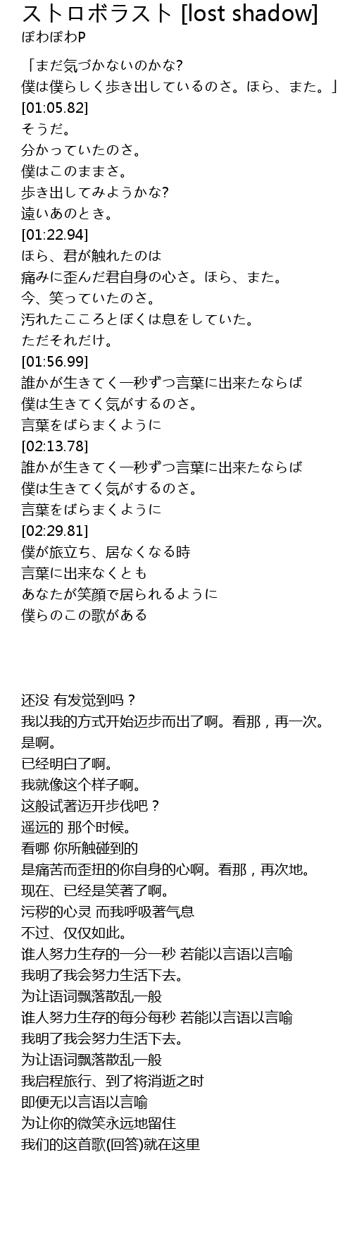 | [00:56.36] | 僕は僕らしく歩き出しているのさ。ほら、また。」 |