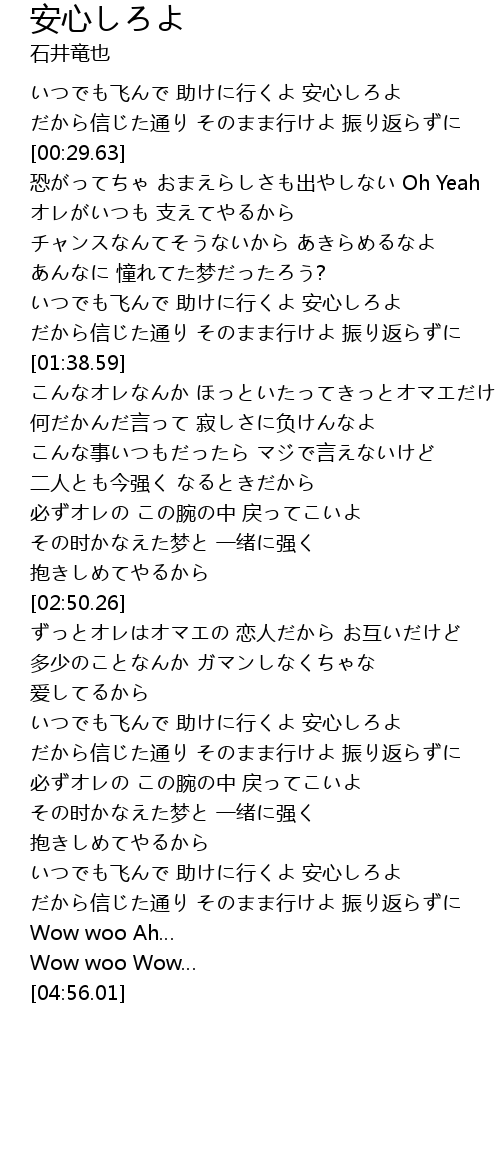 | [01:12.89] | いつでも飞んで 助けに行くよ 安心しろよ |