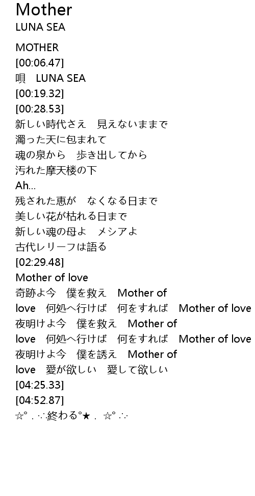 | [04:04.31] | 夜明けよ今 僕を誘え Mother of love 愛が欲しい 愛して欲しい |