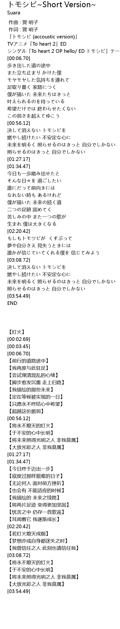| [00:01.67] | 「トモシビ (accoustic version)」 |