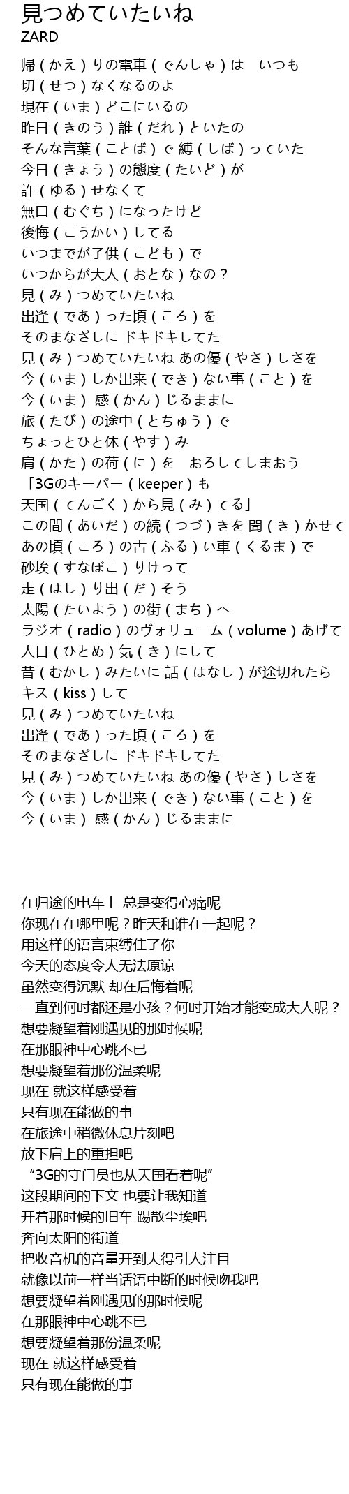 | [02:07.94] | 見(み)つめていたいね あの優(やさ)しさを |
