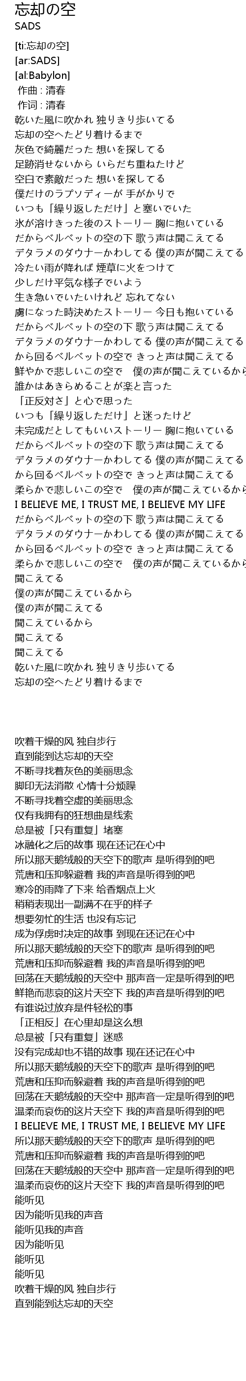 | [04:17.27] | 温柔而哀伤的这片天空下 我的声音是听得到的吧 |