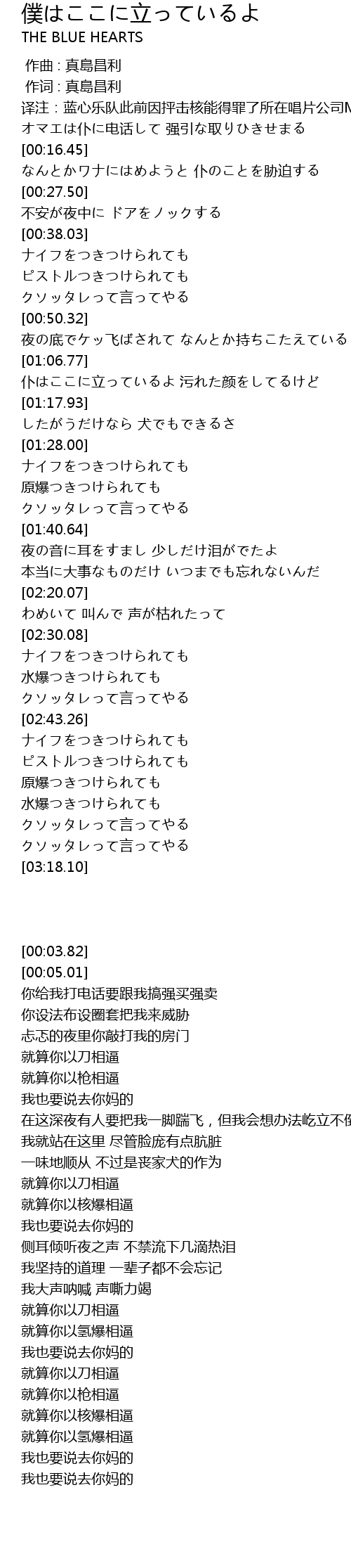 | [00:00.71] | 译注:蓝心乐队此前因抨击核能得罪了所在唱片公司Meldac的投资商三菱电机,并最终导致了与唱片公司的解约。利益相关人士曾通过电话直接向歌手本人施压,此为此歌背景 |