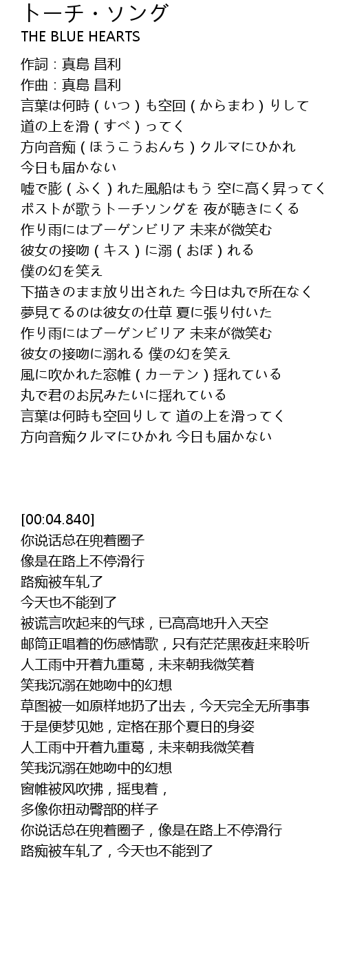 | [00:57.018] | ポストが歌うトーチソングを 夜が聴きにくる |