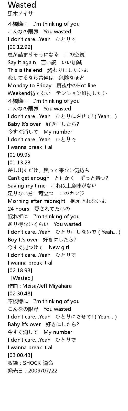 | [01:20.07][01:13.23] | Ai-oh You wasted wasted |