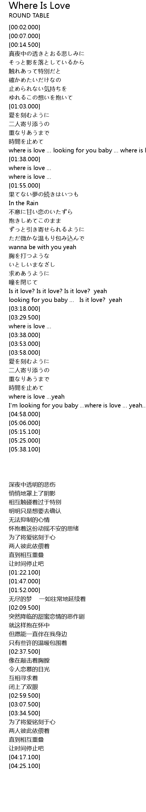 | [01:22.100] | where is love … looking for you baby … where is love … |