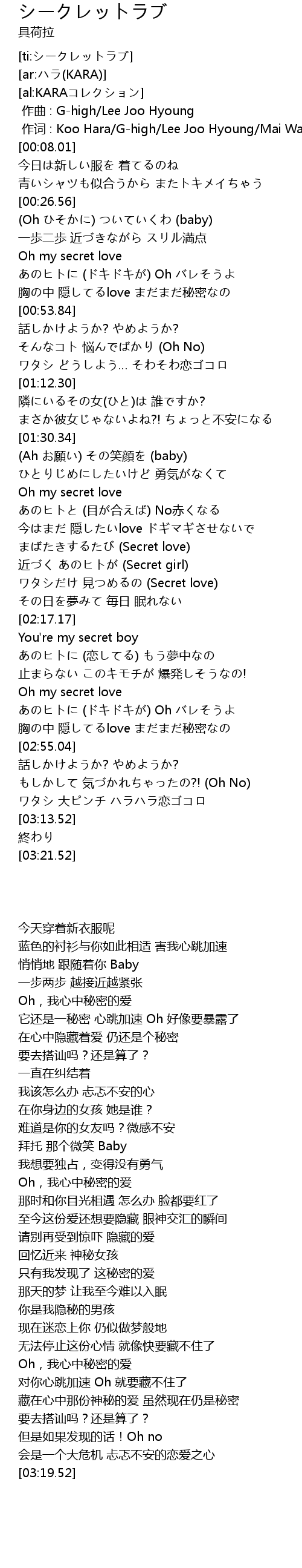 | [00:01.00] | 作词 : Koo Hara/G-high/Lee Joo Hyoung/Mai Watarai |