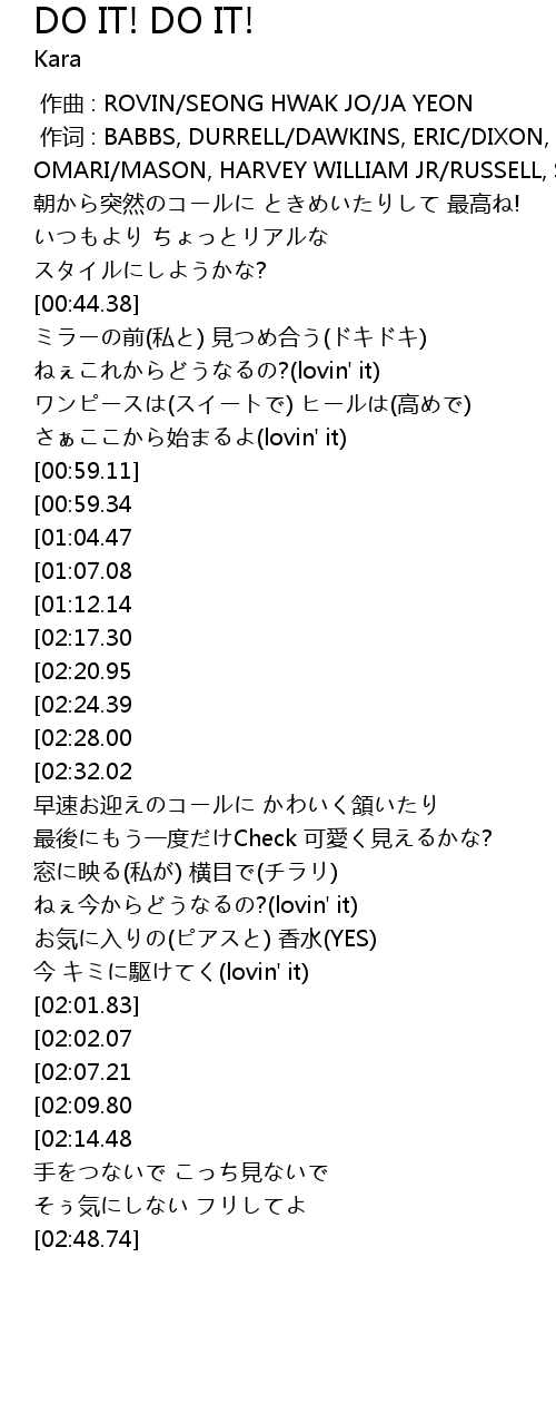 | [03:27.31][02:20.95][01:17.90] | Do it! Do it! |