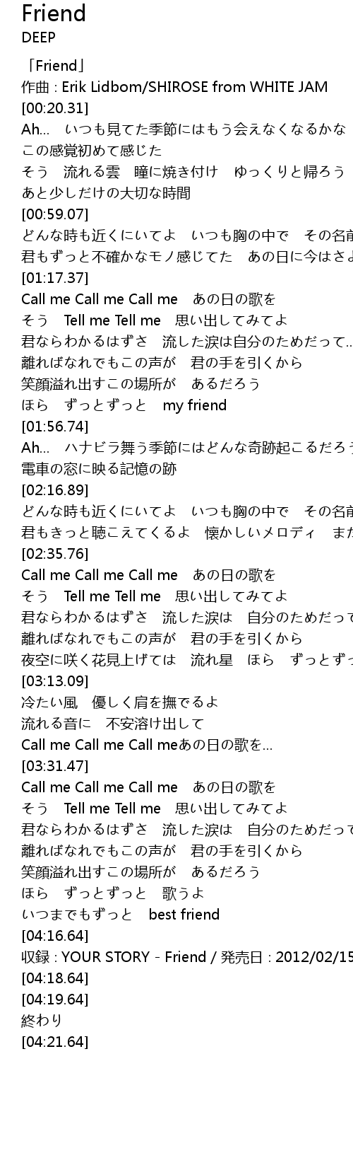 | [04:17.64] | 収録∶YOUR STORY - Friend/発売日∶2012/02/15 |