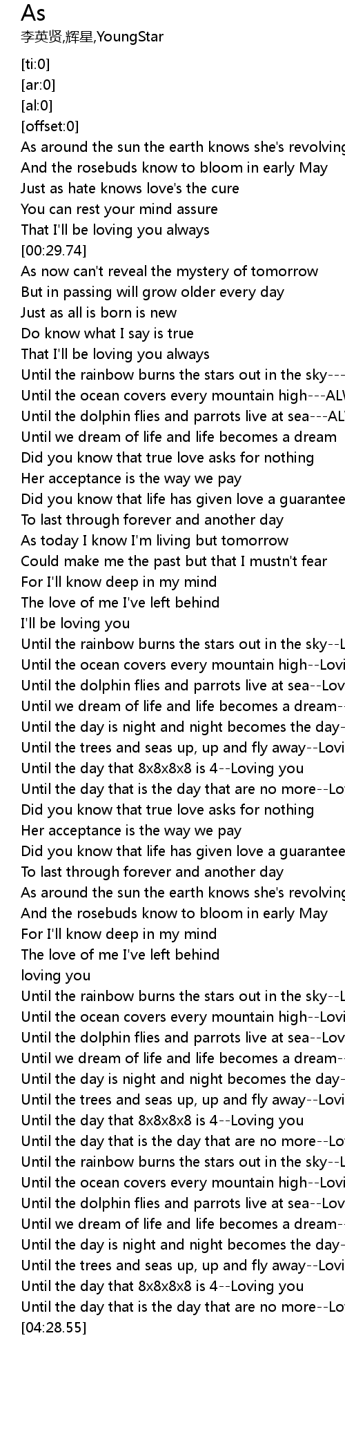 | [00:53.91] | Until the ocean covers every mountain high---ALWAYS |
