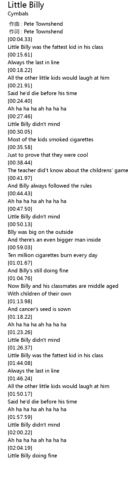 | [01:41.51] | Little Billy was the fattest kid in his class |