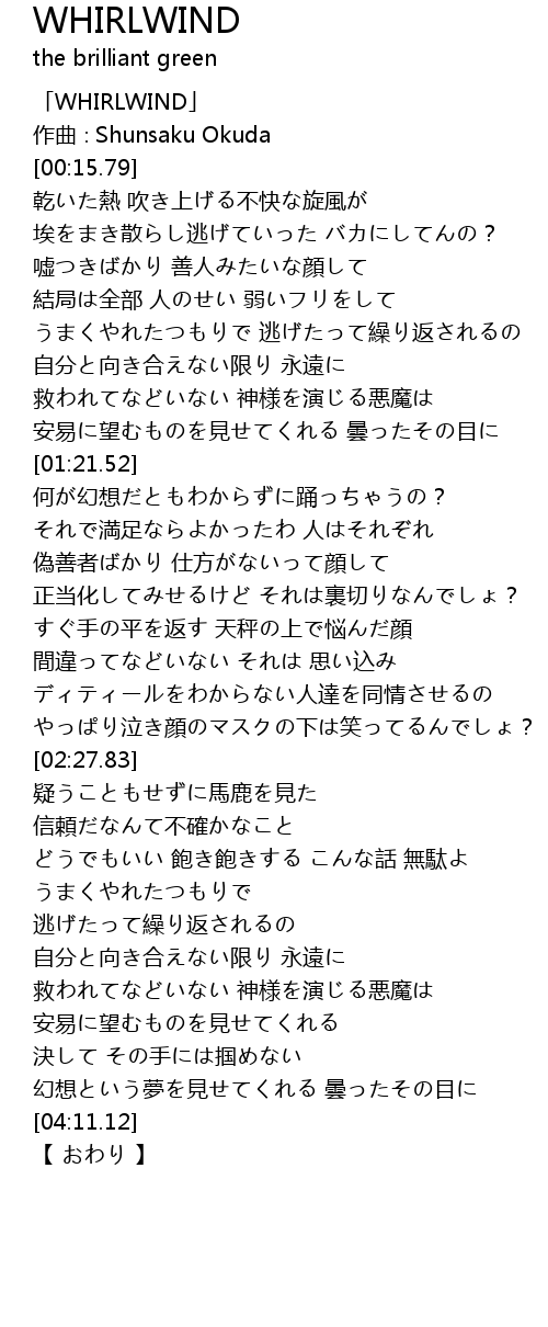 | [00:17.79] | 乾いた熱 吹き上げる不快な旋風が |