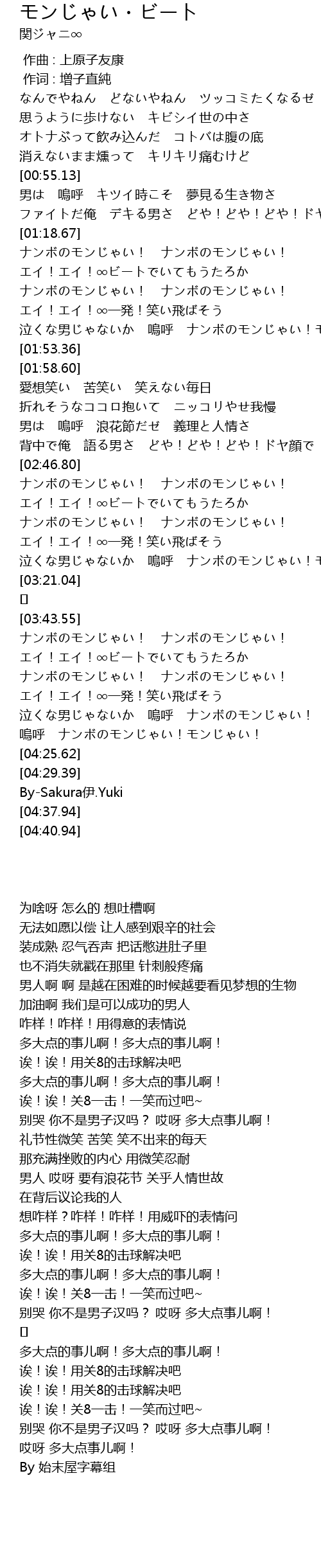 | [03:10.10] | 泣くな男じゃないか 嗚呼 ナンボのモンじゃい!モンじゃい! |