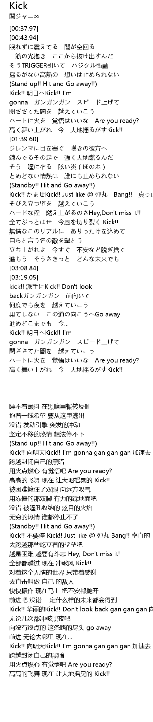 | [02:15.92] | Kick!! かませKick!! Just like @ 弾丸 Bang!! 真っ直ぐに |
