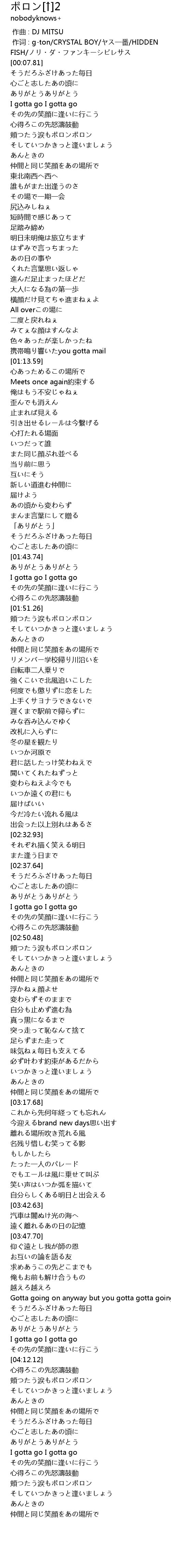 | [00:01.00] | 作词 : g-ton/CRYSTAL BOY/ヤス一番/HIDDEN FISH/ノリ・ダ・ファンキーシビレサス |