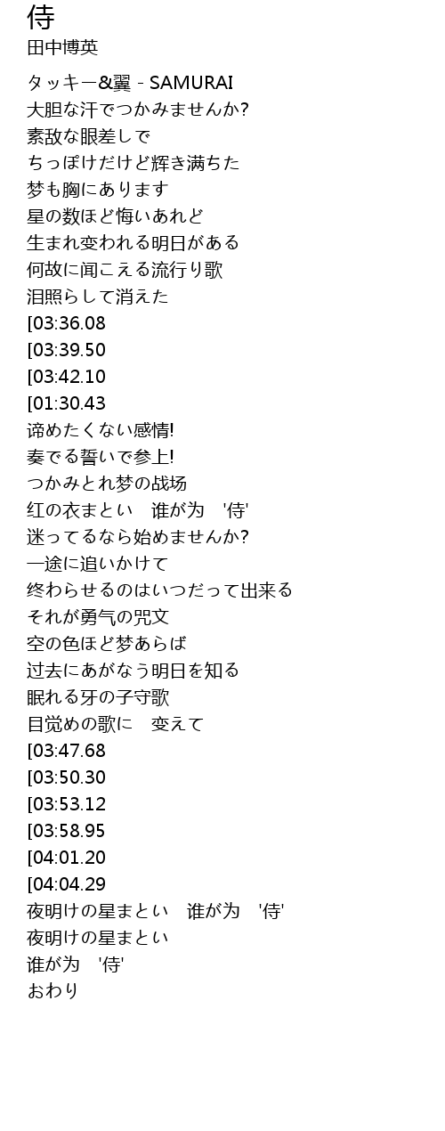 | [01:19.12][01:30.43][02:45.21][02:56.20][03:44.53][03:55.96][04:07.21] | samurai samurai |